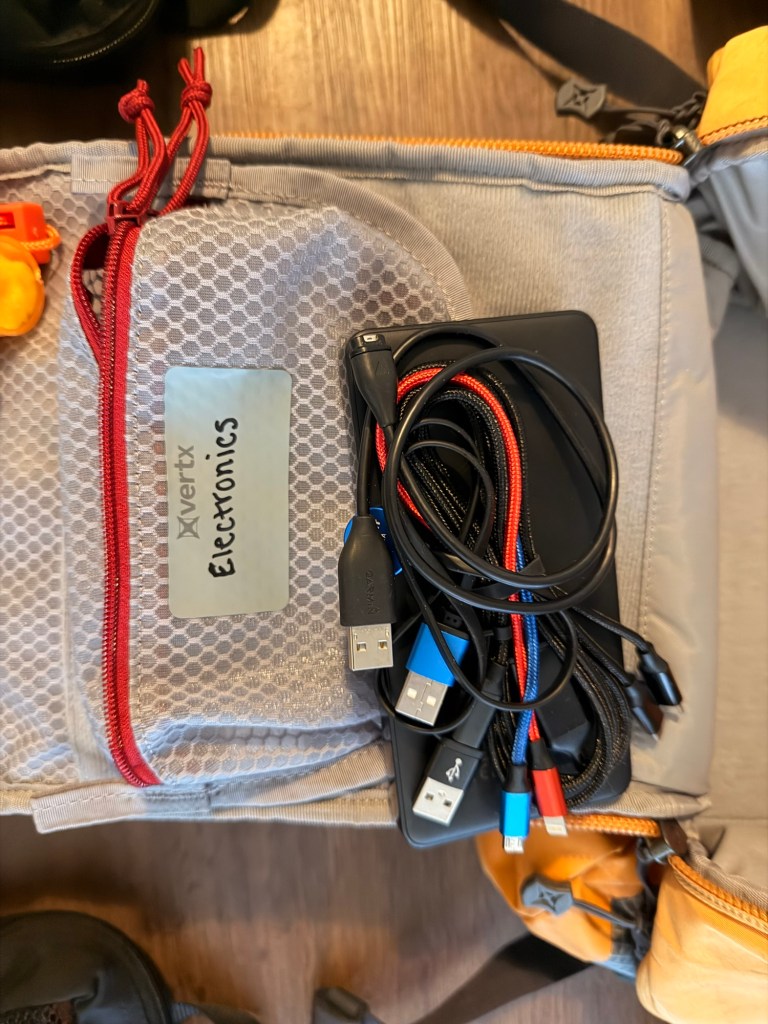 Vertx Overflow Mesh Pouch Small- There are electronics in this pouch (as you can see its label). There is a power bank and a 5 in 1 cord I got off amazon. This can charge just about anything I have.