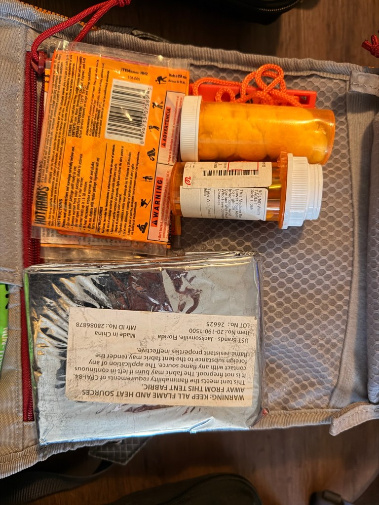 Built in pocket on Backpack- In this pocket I keep items that keep me warm. I have hand warmers, a survival blanket, waterproof matches, flint and steel and fire starter.