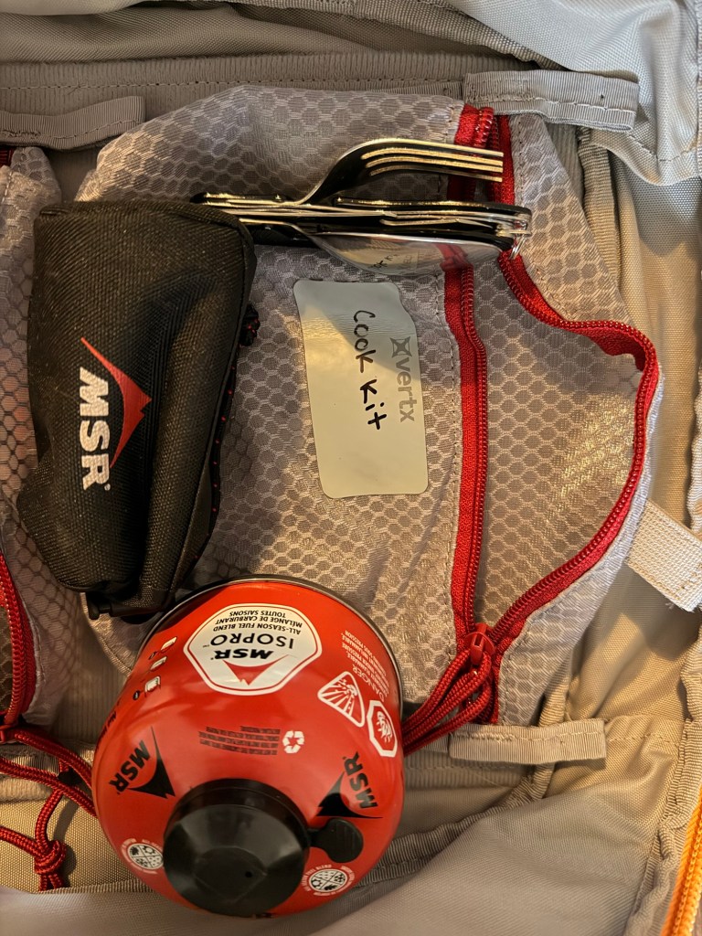 Vertx Overflow Mesh Pouch Medium- Inside this pouch is a backpacking stove, MSR fuel canister and a spoon. This can be used to in conjunction with the nesting cup to boil water or melt snow. This accomplishes a bunch of things like making food and purifying water.