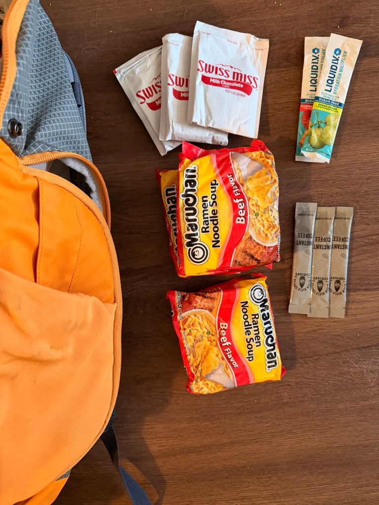 Side Pocket- In this pouch there are three ramen packets, a couple of hot chocolate mixes and instant coffee mixes.