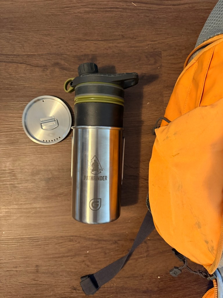 Side Pocket- Inside this pouch is Grayl water purifier with the 30 oz Geopress nesting cup with a lid. This is my backup water filter, and the nesting cup can be used to boil water in conjunction with the fuel and stove in another pouch.