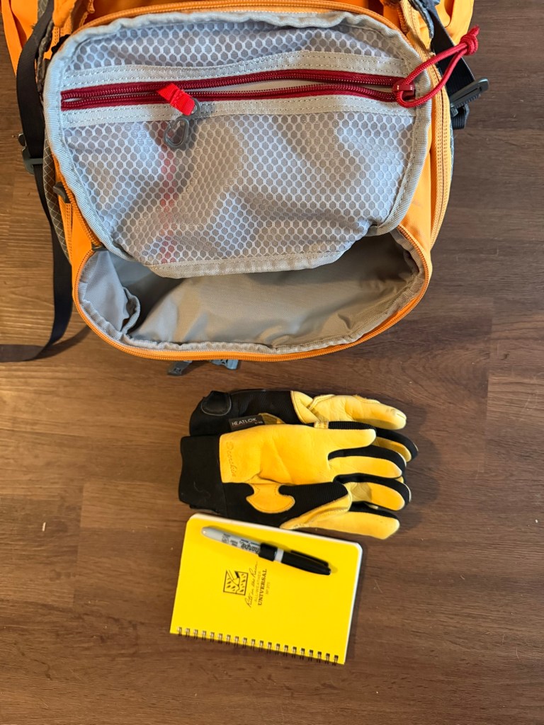 Top compartment- in this compartment there is work gloves another sharpie and rite in the rain notebook. It is really nice to have the ability to leave notes as well as take notes of various things.