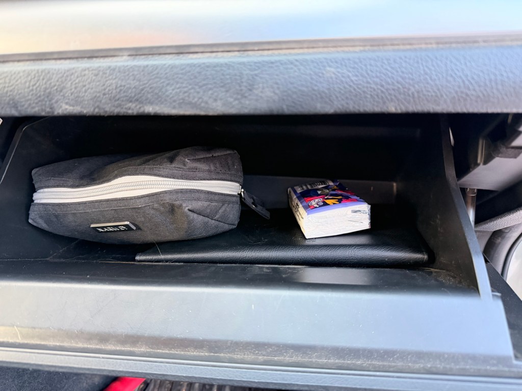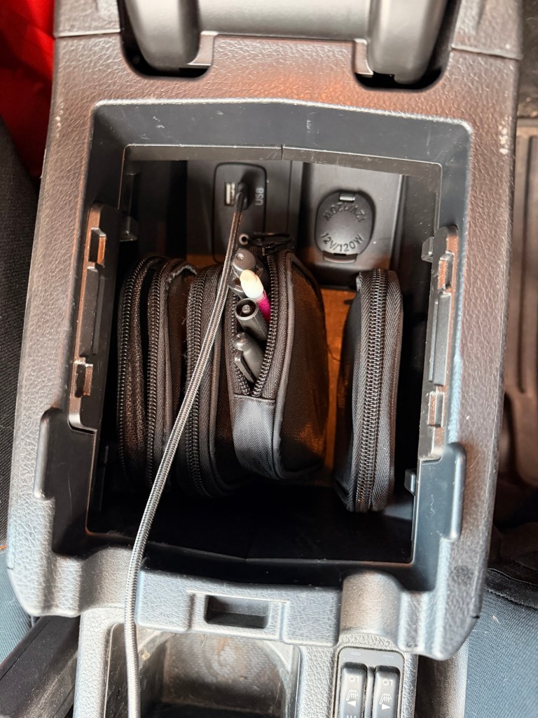 Center console- Inside of here I found some amazon pouches that fit perfectly into the console. It came with a pack of four so one pouch has some pens and pencils, another has a quick boo boo kit. Inside that is antiseptic wipes and band aids, this pouch is much more accessible to get in and out of rather than the big first aid kit from the backseat. The third pouch has just an extra head lamp and the charging cord. The fourth is just misc. gear I put it in the pouch, so it isn’t just floating around. I then have my phone charger plugged in.