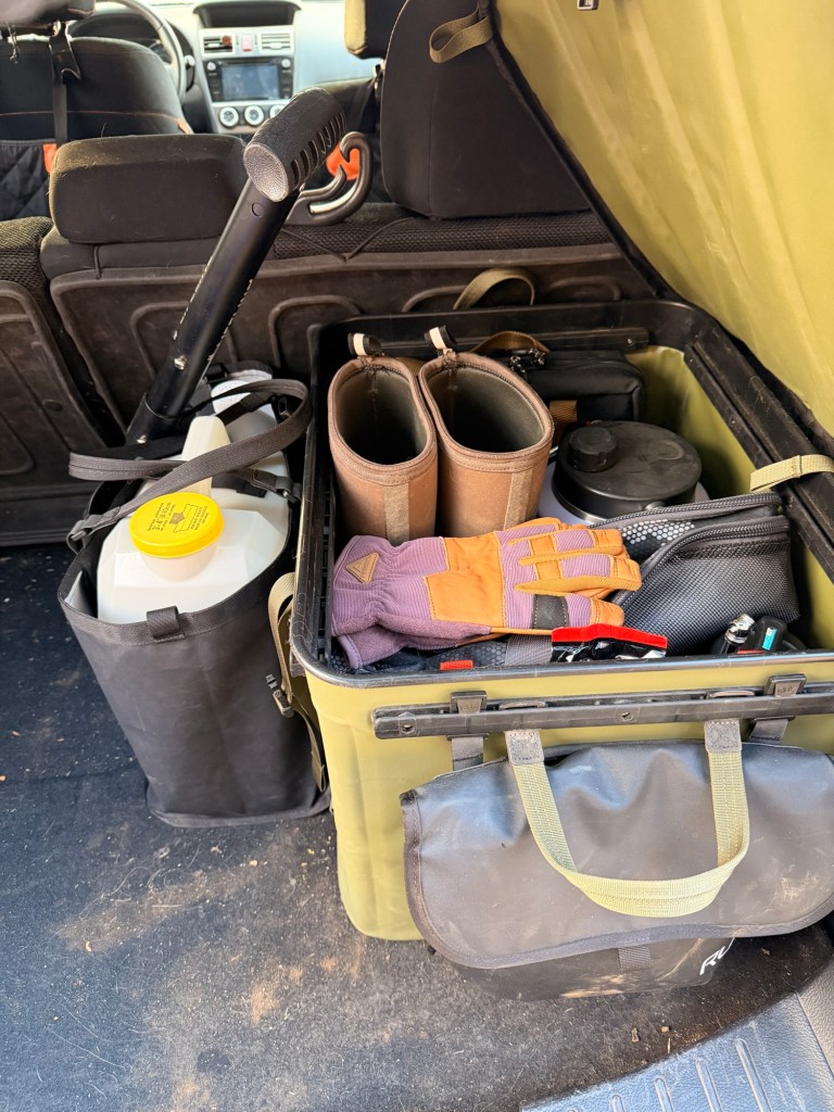 Sitting next to the Rux is the Rux bag, inside is a bin of kitty litter for traction if stuck and extra windshield wiper fluid. Finally, I have a small shovel leaning against it and a fire extinguisher in the back cargo area as well. In the summer time the Rux bag and shovel are not kept in the car and my extra boots aren’t mucks they are some old hiking boots.